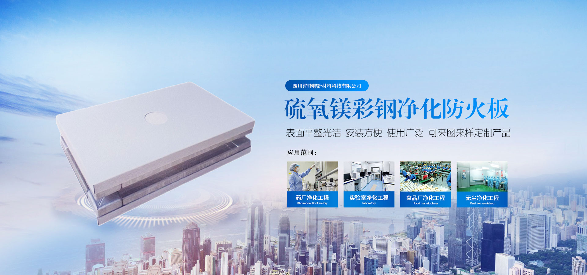 四川普菲特新材料科技有限公司,根據(jù)潔凈室彩鋼板防火要求,研制生產(chǎn)的硫氧鎂彩鋼防火板。它是以綠色環(huán)保建材為主體, 經(jīng)特殊的生產(chǎn)工藝,科學(xué)的安裝接點(diǎn)而成的,新穎潔凈室墻體材料。